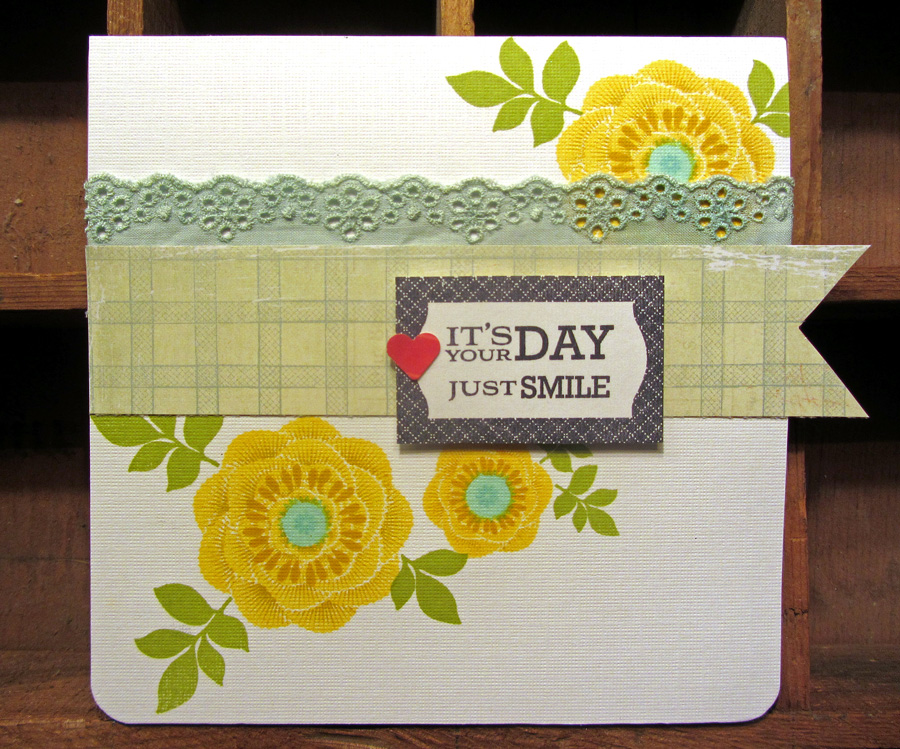 I am a HUGE fan of Mustard Yellow and Turquoise so this challenge just spoke to me!! I was Inspired by a card color combo that Danielle Flanders used awhile back and I had to use it for this challenge!! I used a fun stamp set and inks from Paper Trey Ink and some Vintage Lace I found at a Junk Jaunt!! I LOVE the way it turned out!! =) Here is my card!!