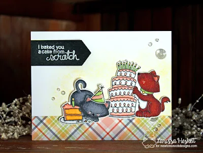 Larissa here to share a Cute Little Baking Cats Birthday Card, I've made for the Newton's Nook Designs Blog!! I've used not one, but two of the Sweet Images from our Newton Loves Cake Stamp Set to create an adorable Birthday Celebration on this card!! I LOVE how it turned out!! I Colored the images with Spectrum Noir Alcohol Markers!! I've even adding extra details on the cats including some Sweet little Spots on their Cheeks with a White Gel Pen and the some Morning Dew Tonic Nuvo Drops to the Birthday Hat and ALL of the Fire Tops of the Candles!! Then I Die Cut each of the Images out using the Newton Loves Cake Die Set and added them to this card with some Plaid Paper from My Mind's Eye and an Inked Background with some Scattered Straw Distress Ink!! I added some Sparkling Clear Sequins (in 4, 6 and 10 mm) from Pretty Pink Posh!! To finish off the card I added the "I baked you a cake from Scratch" Sentiment that goes PURR-FECTLY with those Cats and their YUMMY Cake!! I'm sure the Recipient of this card will have a big smile when they open it!!