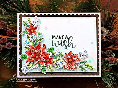 I Stamped and Embossed the "make a wish" sentiment from the Birthday Essentials Stamp Set to turn this card into a birthday card! I wanted the Sentiment to SPARKLE so I used some WoW Neutral Shimmer Glitter Embossing Powder!! Its hard to see in the Photos, but in real life that little addition of adds a TON of Beauty to this Card!! If you are still creating Christmas cards, this would make a stunning Holiday Card too. Just add in a Holiday sentiment. I framed the lovely floral panel using the scallop edged frame from our Frames & Flags Die Set. To finish off the Design and add even MORE SPARKLE, I added some Tonic Studios Blizzard Glitter Drops (BONUS it matches the Glitter in the WoW Embossing Powder) to ALL of the Berries and then I added some Sunrise Glitter Drops to the Poinsettia Flower Centers!! A few Pretty Pink Posh Iridescent Star Sequins scattered around Finishes off the Design!!