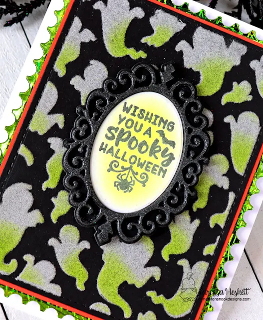 I replaced the Ghost Stencil over the Flocked Ghost Images and then Inked with some Twisted Citron Distress Ink, using an Ink Dauber and Inking at the Bottom of the Ghost Images to add that Glow-in-the-Dark look!! I LOVE how the little touch of Ink really makes the Ghost Images POP of the Card Panel!!